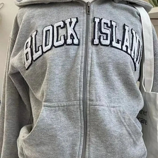Women's Retro Gray Hoodie Letter Embroidery Casual Loose Coat