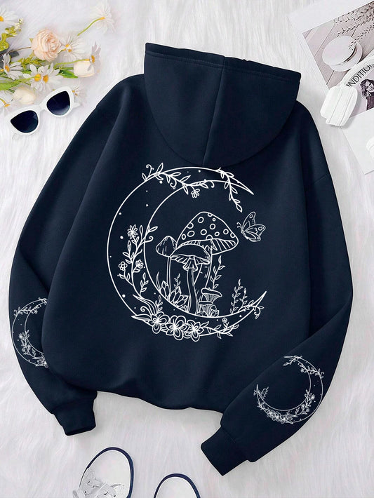 Mushrooms on the Moon Graphic Hoodie Funny Oversized Fleece Sweatshirt