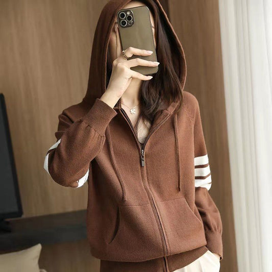 Frauen Hoodies Sweatshirts Lose Mantel Tops Gestreiften Reißverschluss Gestrickt