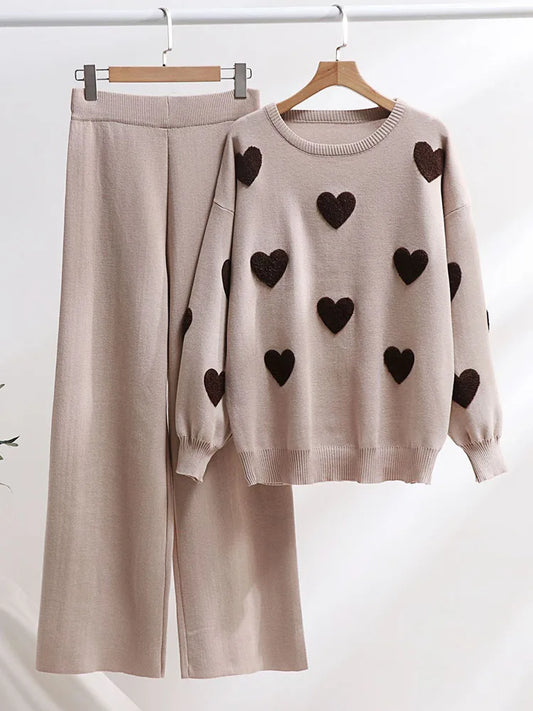 Heart Sweater Pants Set Women Winter Knitted Suit