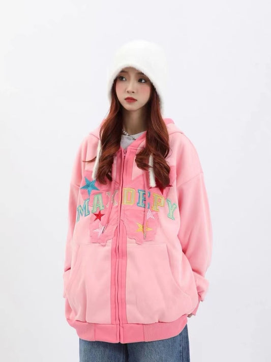 Gestickte Hoodies Frauen Casual Kawaii Sweatshirt Hoodie Koreanische Lose Zip Up Kleidung Y2k Top