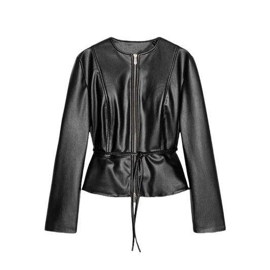 Spring Vintage Waist Skirt with Hem Imitation Leather Jacket Women