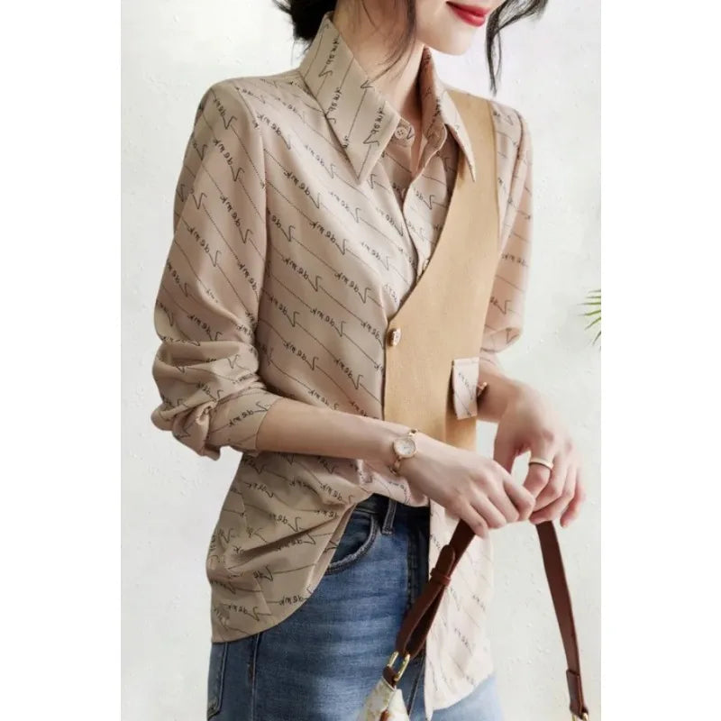 Womens Button Shirt Layered Look Letter Print Long Sleeve Blouse