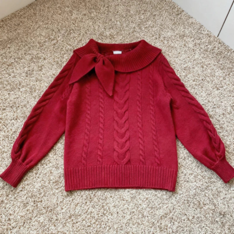 Christmas, Bow, Knitted Sweater, Women, Y2K, Red Pullover