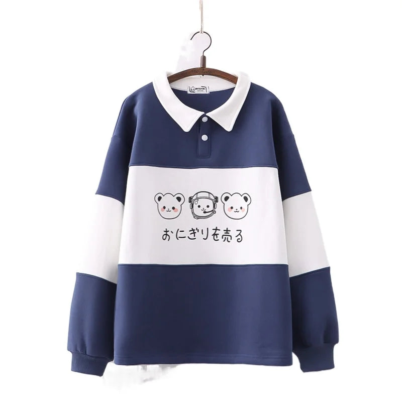 2023 Herbst Kawaii Cartoon Bär Sweatshirt – Fleece, gefälschter Zweiteiler mit Umlegekragen