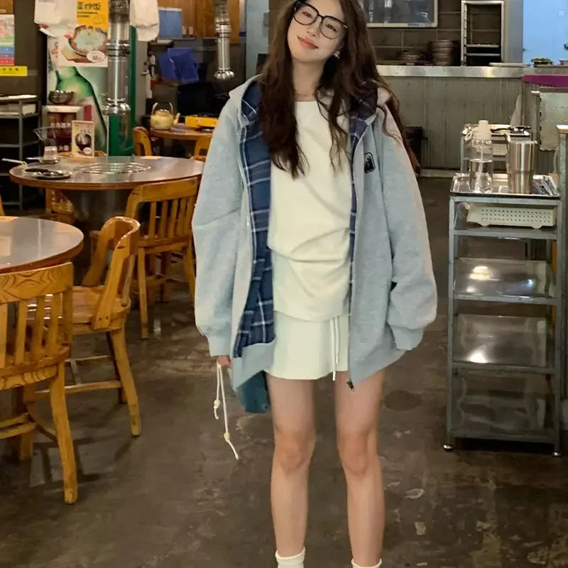 Oversized Brown Zip Up Hoodie Women Lattice Stitching Fall Jacket