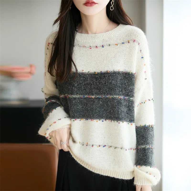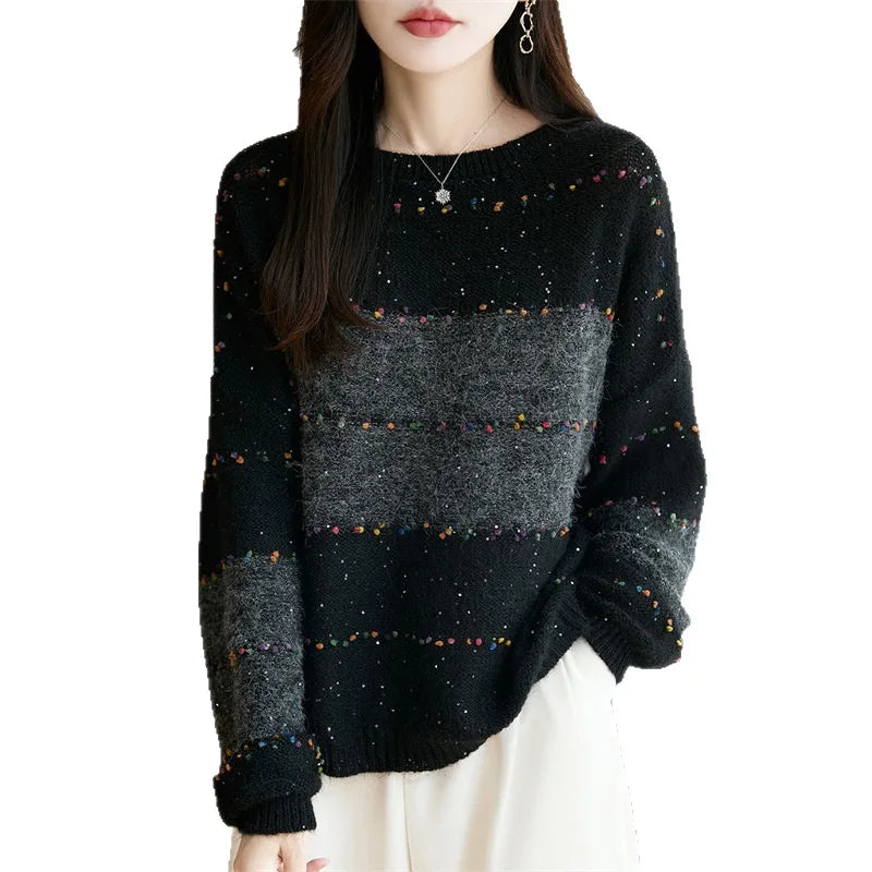 Plus Size Sequin Sweater Womens Color Block Stripe Knit Pullover