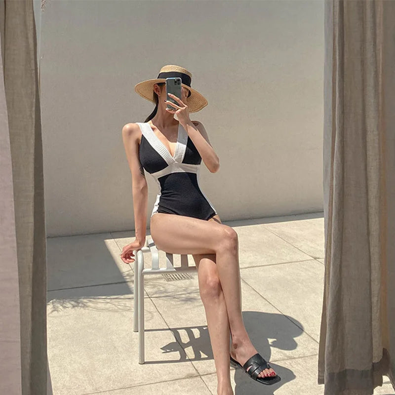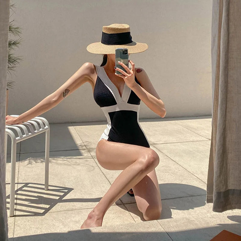 Frauen Schwarz und Weiß Patchwork Push Up Badeanzug Cut Out One Piece