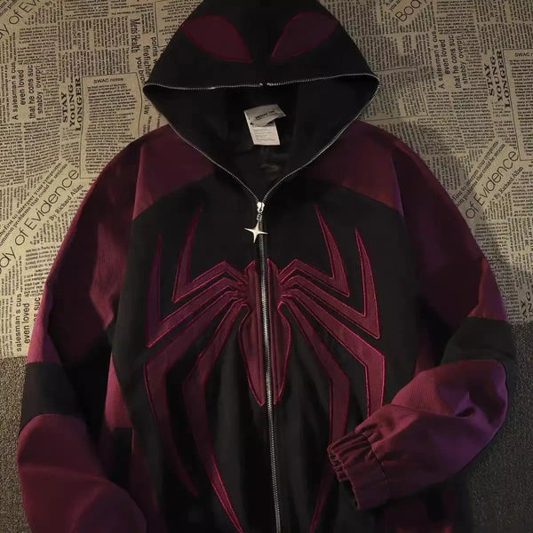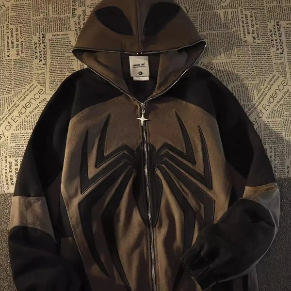 Schwarzer Spider Web Y2K Übergroßer Reißverschluss-Hoodie für Damen