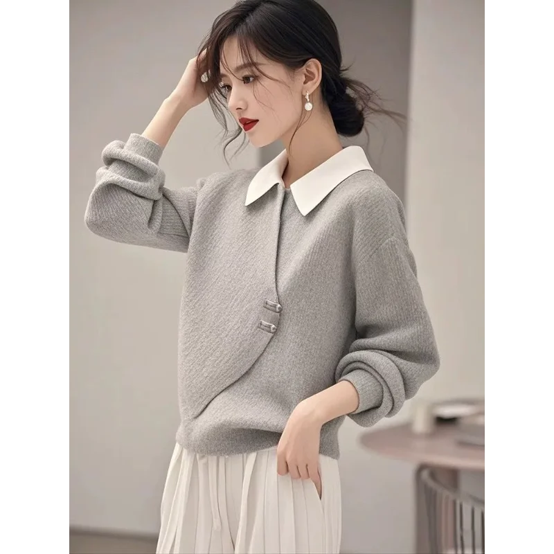 Womens Corduroy Sweatshirt Layered Look Gray Polo Collar Korean Style