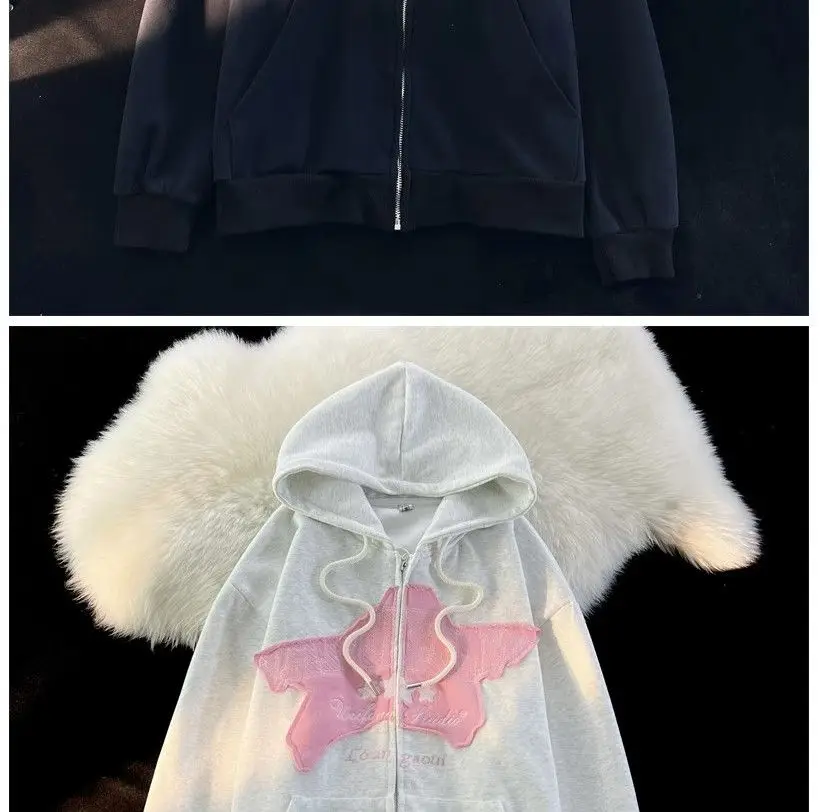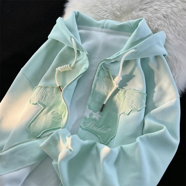 American Retro Star Patch Zipper Hoodies Cardigan for Women