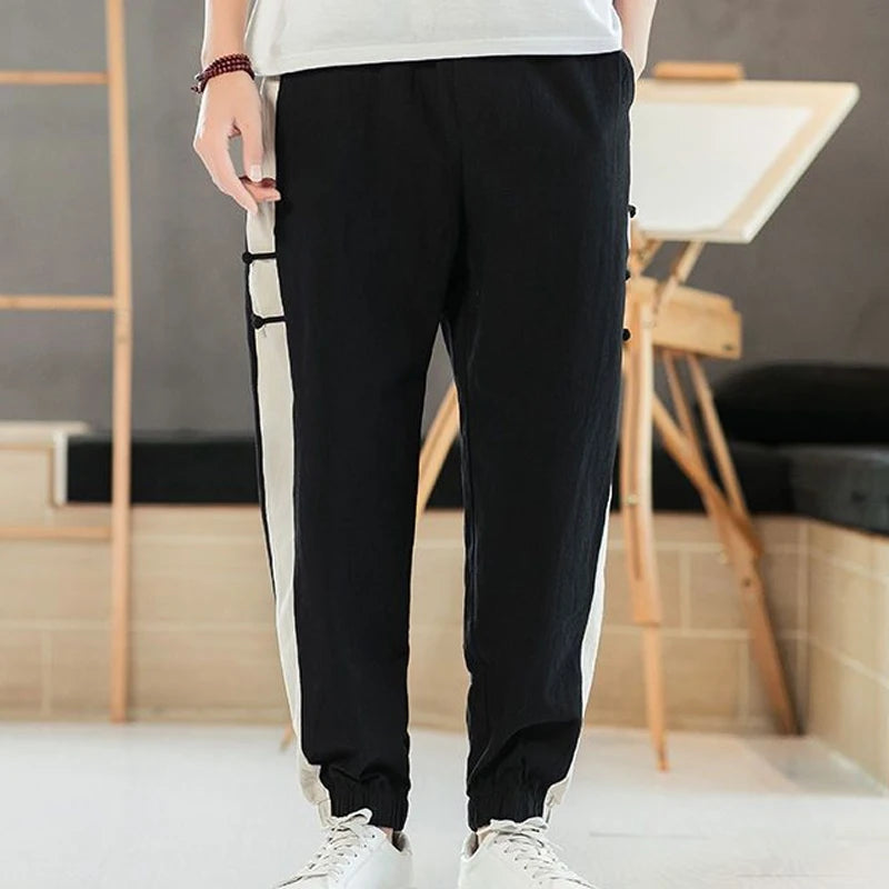 Elastic Waist Haren Pants Man Contrast Color Pockets Patchwork Cotton Hemp Casual
