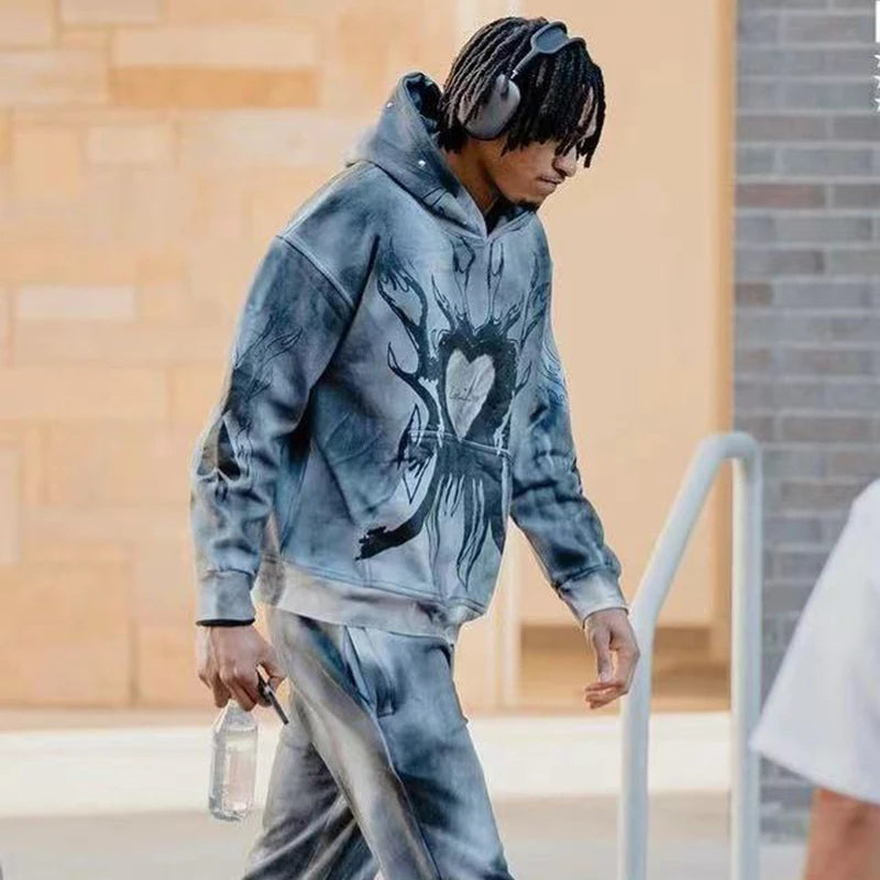 Men Retro Tie-Dye Love Print Fleece Hoodie