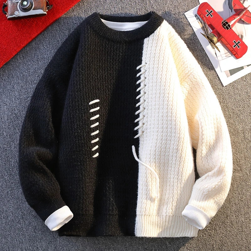 Mens Crew Neck Sweater Drawstring Splice Knit Pullover Fall Winter