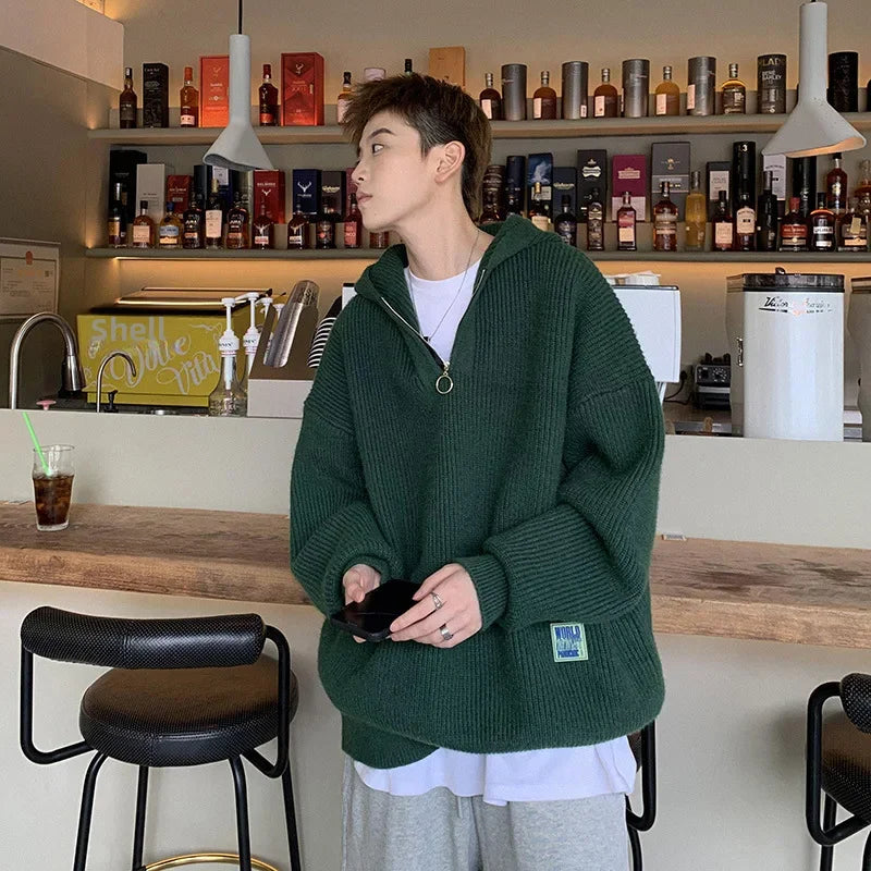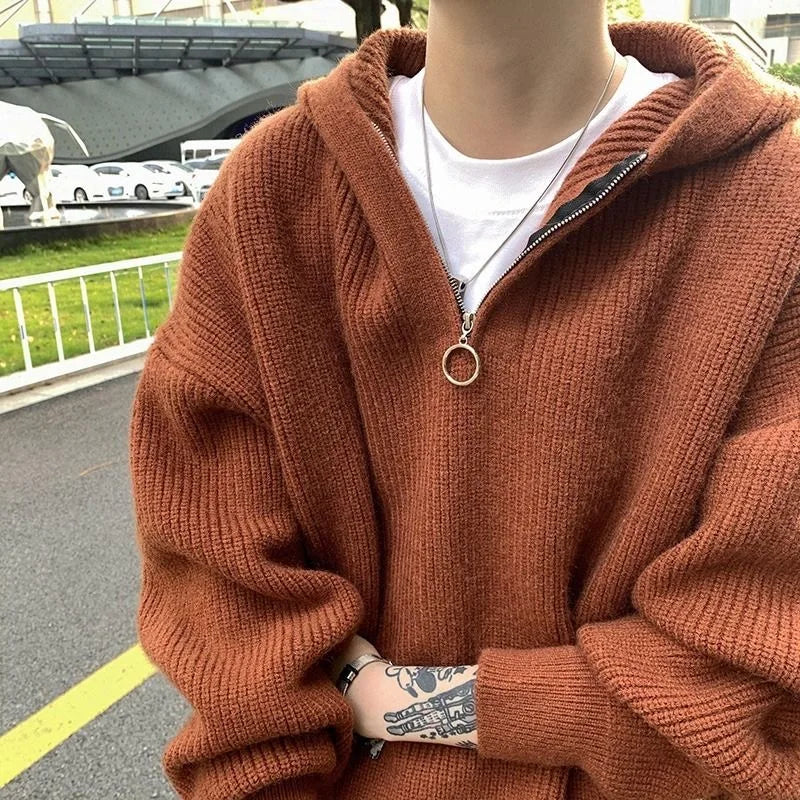 Mens Half Zip Hooded Sweater Oversized Knit Pullover Winter Solid