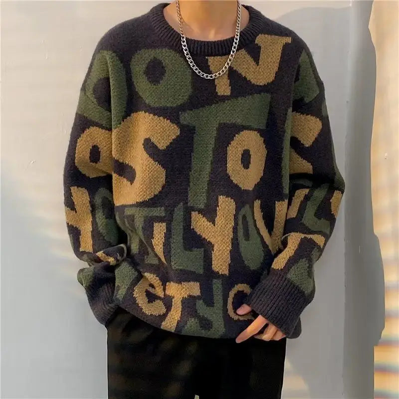 Mens Y2K Letter Print Knit Sweater Vintage Streetwear Pullover