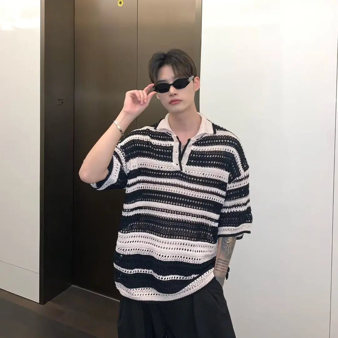 Retro Rainbow Striped Knit Polo Shirt Men Harajuku Loose Casual