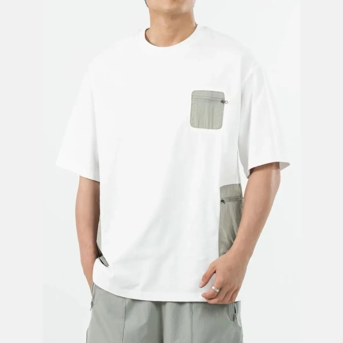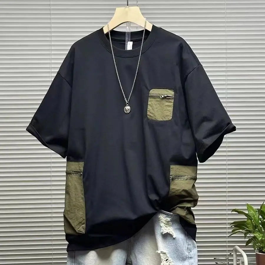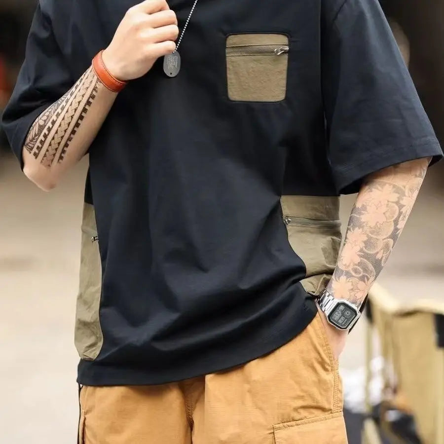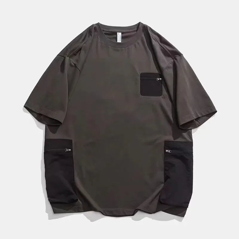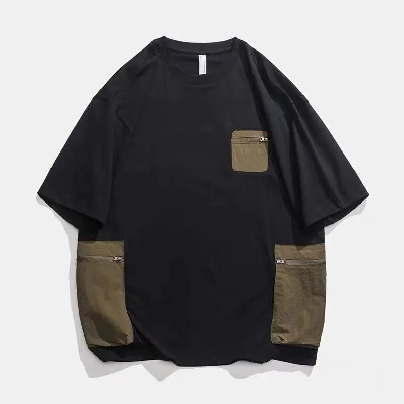 Urban Streetwear Men Colorblock Tshirt Contrast Zip Pocket