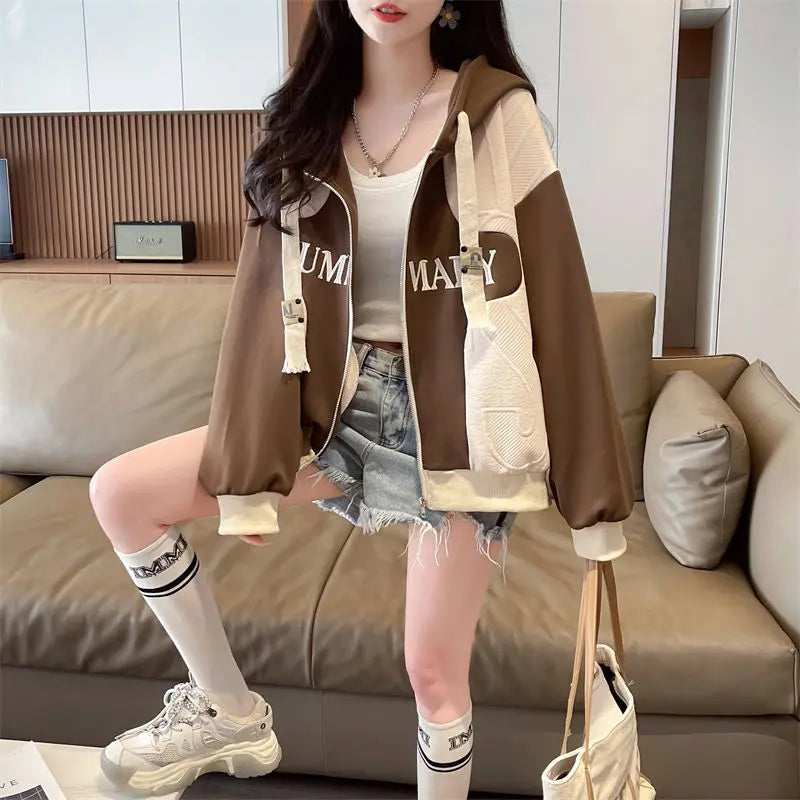 Womens Lightweight Hooded Baseball Jacket Loose Varsity Top