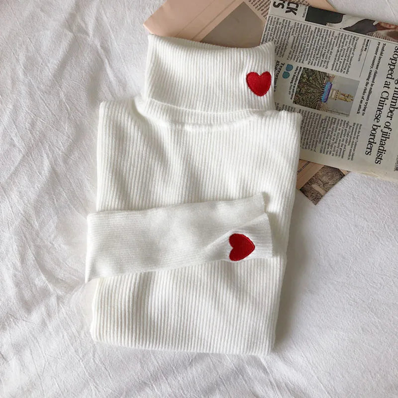 Women's Pullovers Heart Embroidery Turtleneck Sweater Tops