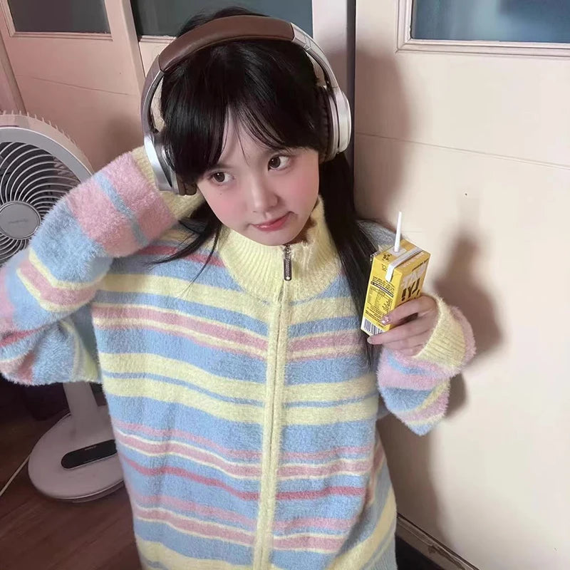 Y2K Striped Knitted Cardigan Women Vintage Oversized Winter Outfit