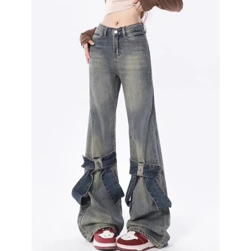 Y2k Vintage Flare Jeans Women Bow Patchwork